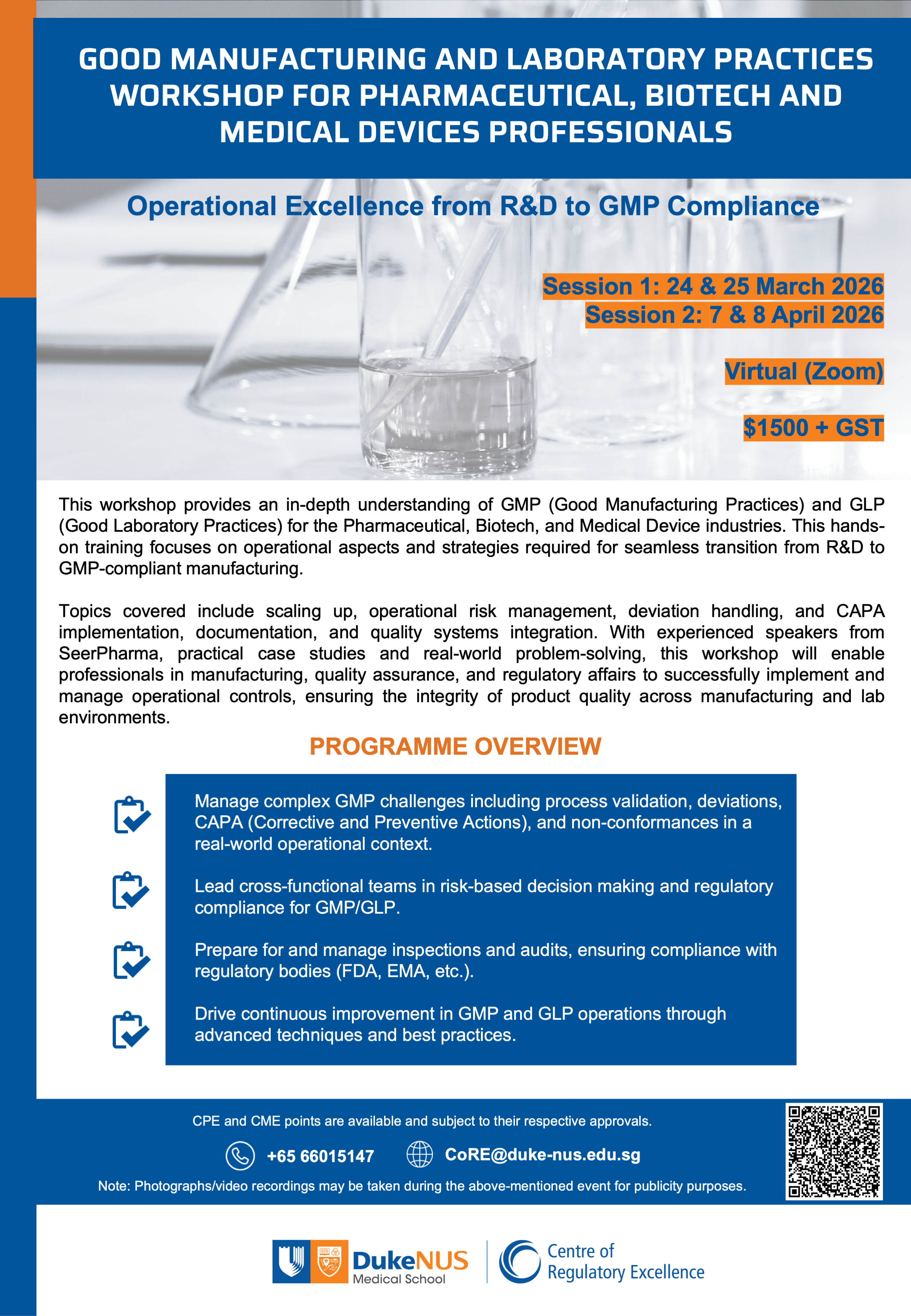 This workshop provides an in-depth understanding of GMP (Good Manufacturing Practices) and GLP (Good Laboratory Practices) for the Pharmaceutical, Biotech, and Medical Device industries. This hands-on training focuses on operational aspects and strategies required for seamless transition from R&D to GMP-compliant manufacturing.