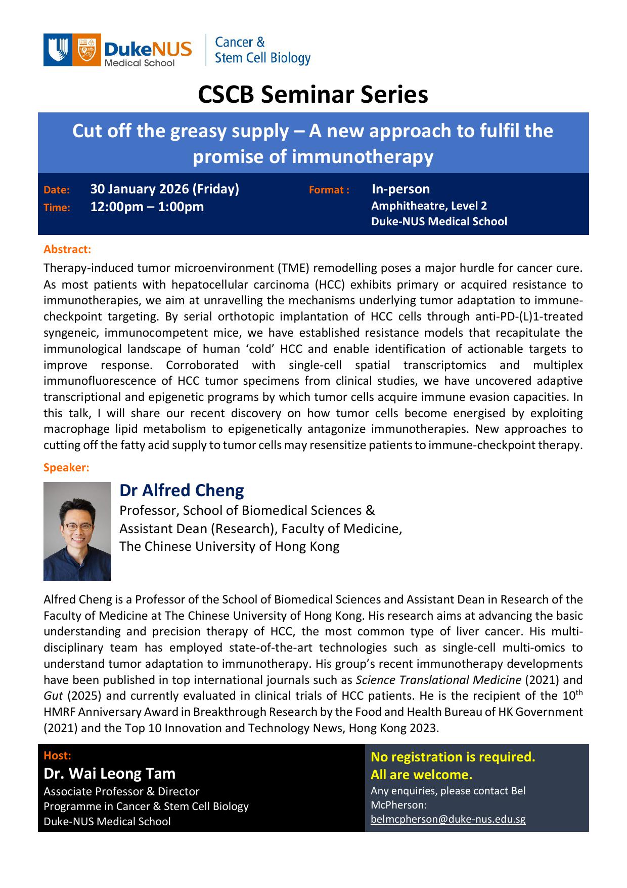 Noon CSCB Seminar: Dr. Alfred Cheng - “Cut off the greasy supply – A new approach to fulfil the promise of immunotherapy”