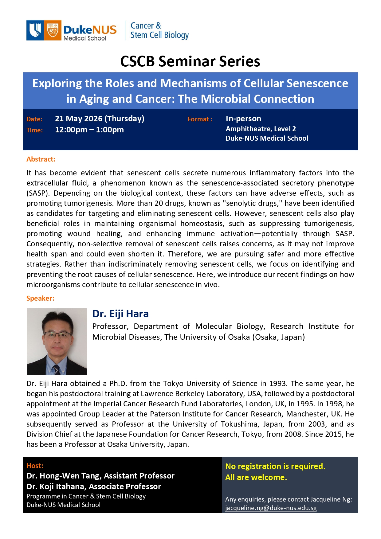 Noon Seminar: Dr. Eiji Hara - “Exploring the Roles and Mechanisms of Cellular Senescence in Aging and Cancer: The Microbial Connection”