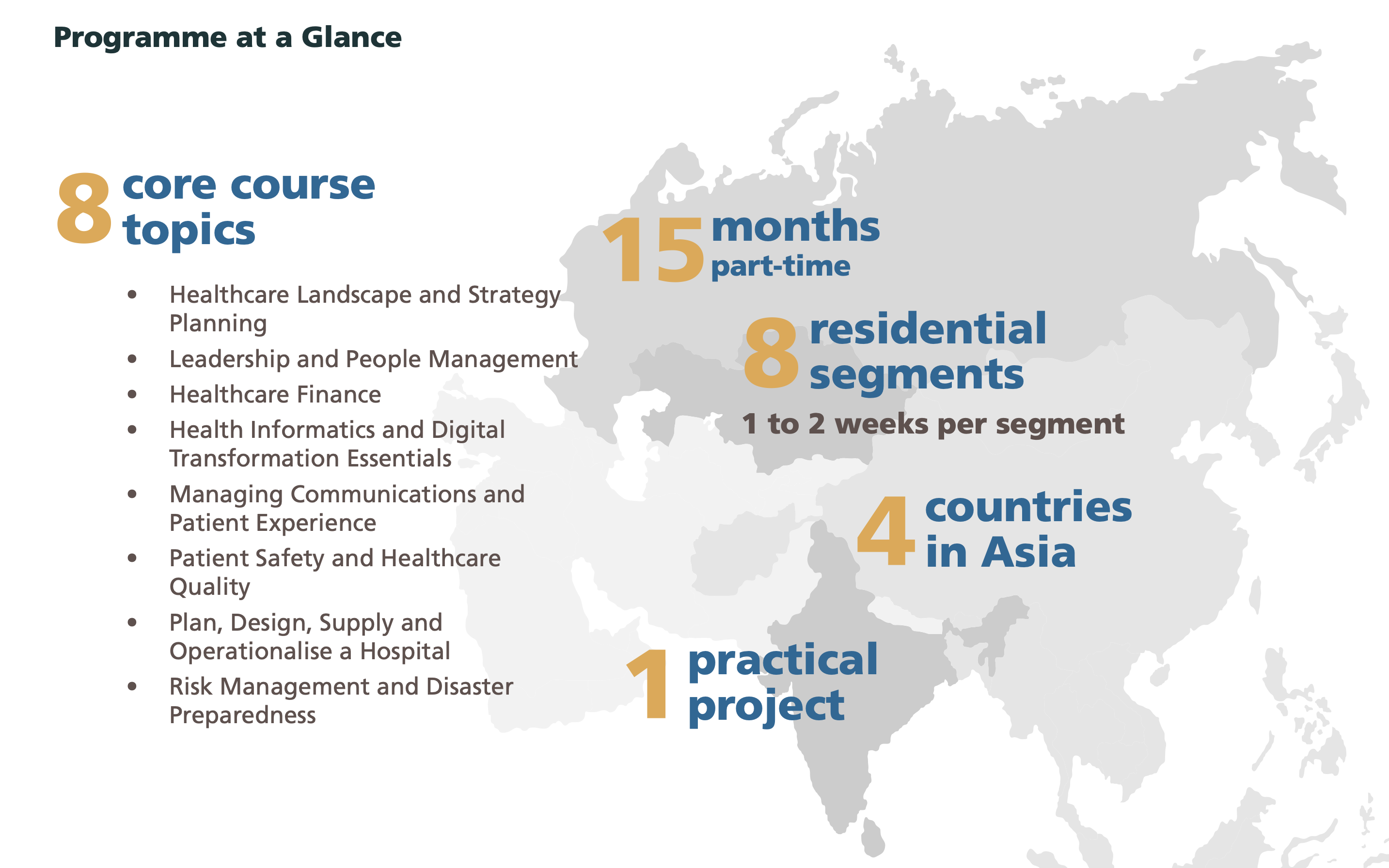 A combination of courses taught by faculty from the region, and SingHealth, Singapore’s largest public healthcare cluster, complemented by site visits to health systems across the region will allow you to observe how the theory discussed in class is applied, giving you the opportunity to discuss, analyse and be inspired by real-world examples of models of care and health systems in Asia.